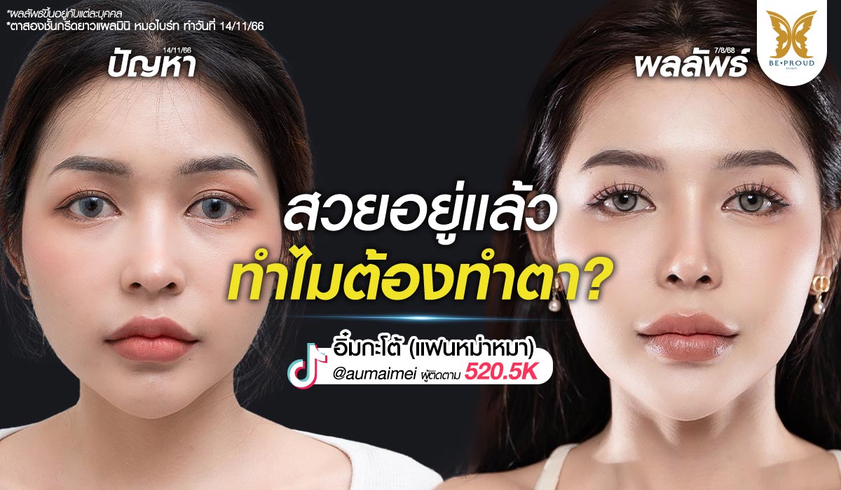 รีวิวตาสองชั้นฉบับคนที่ชอบแต่งหน้า !! คุณอุ๋มอิ๋ม อินฟลูเอนเซอร์จากช่อง อิ๋มกะโต้ (แฟนหม่าหมา) @aumaimeii ที่มีผู้ติดตามกว่า 505K เป็นคนที่แต่งหน้าทุกวัน ส่วนตัวคุณอุ๋มอิ๋มมีตาสองชั้นอยู่แล้ว แต่รู้สึกว่าชั้นตาแอบเล็ก พอติดขนตาแล้วรู้สึกยังไม่จึ้ง จึงตัดสินใจทำตาสองชั้นปรับชั้นตาให้ชัดขึ้นที่บีพราวด์คลินิก หลังประเมินโครงสร้างตากับ “คุณหมอไบร์ท” นพ.ชยุตม์ ฝูงทองเจริญ ว.38429 แพทย์ทำตาสองชั้นประจำบีพราวด์ คลินิก โดยคุณหมอแนะนำให้ทำ ‘ตาสองชั้นเทคนิคกรีดยาวแผลมินิ’ เพื่อปรับให้ชั้นตาสูงขึ้นและเท่ากันมากขึ้น มาดูผลลัพธ์หลังทำตาสองชั้นกันเลย !! สารบัญ ศัลยกรรมตาสองชั้นของคุณอุ๋มอิ๋ม รีวิวตาสองชั้นกรีดยาวแผลมินิ ศัลยกรรมตาสองชั้นของคุณอุ๋มอิ๋ม หลายคนอาจจะมองว่าคุณอุ๋มอิ๋มมีตาสองชั้นสวยอยู่แล้ว แต่ตัวคุณอุ๋มอิ๋มซึ่งต้องแต่งหน้าให้ตัวเองทุกวัน รู้สึกว่าชั้นตาตัวเองซ้อนกันหลายชั้น ชั้นตาเป็นริ้ว ๆ ทำให้แต่งหน้ายาก บางครั้งต้องติดสติ๊กเกอร์ตาสองชั้นเพื่อให้ชั้นตาชั้นขึ้นและไม่เป็นริ้ว คุณอุ๋มอิ๋มตัดสินใจลงทุนกับความมั่นใจ เลือกทำตาสองชั้นด้วยเทคนิคกรีดยาวแผลมินิ เทคนิคเฉพาะของบีพราวด์คลินิก ซึ่งคุณหมอจะเปิดแผลเล็กเพียง 0.5 ซ.ม.เท่านั้น แล้วเข้าไปจัดการตัดแต่งหนังตาและไขมัน รวมถึงเย็บล็อกชั้นตาเพื่อสร้างชั้นตาใหม่ที่สวยงามขึ้นมา ซึ่งข้อดีของเทคนิคกรีดยาวแผลมินิ มีทั้งขนาดแผลที่เล็กมาก การล็อกชั้นตาแน่นได้เสมือนกับเทคนิคกรีดยาว การเย็บแบบซ่อนปมไหม ซึ่งส่งผลให้ผลลัพธ์บวมช้ำน้อย ไม่ต้องพักฟื้นนาน และลดโอกาสเกิดรอยแผลเป็นในอนาคต หลังทำตาสองชั้นเทคนิคกรีดยาวแผลมินิ คุณอุ๋มอิ๋มก็ได้ชั้นตาสวยแบบถาวร ซึ่งบอกเลยว่าชั้นตาใหม่ไม่ใช่แค่เพียงทำให้สวยขึ้น […]