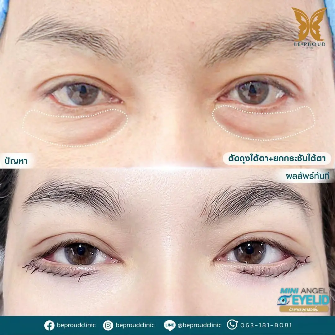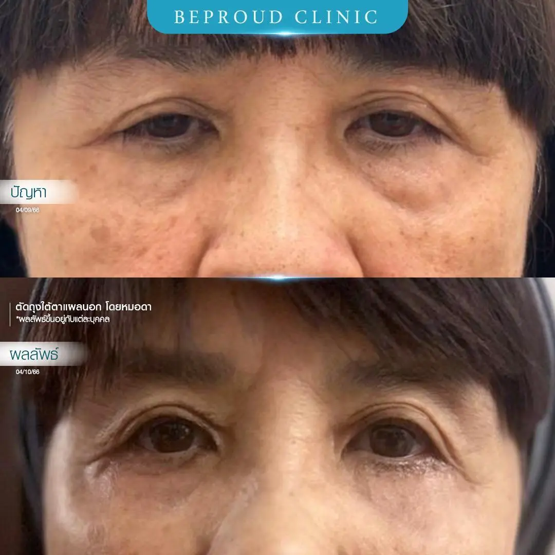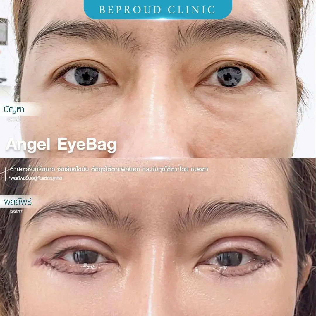 ภาพรีวิวเปรียบเทียบผลลัพธ์ ก่อนทำ-หลังทำศัลยกรรมแก้ตาสองชั้น ของเคสตัวอย่าง เทคนิคกรีดตายาว จัดเรียงไขมัน แก้หัวตา แก้กล้ามเนื้อตาอ่อนแรง ตัดถุงใต้ตาแผลนอก ตัดถุงไขมัน เลาะเอ็นร่องน้ำตา เติมไขมันร่องน้ำตา เย็บกระชับเอ็นกล้ามเนื้อตา โดยอ.หมอหลิง บีพราวด์คลินิก